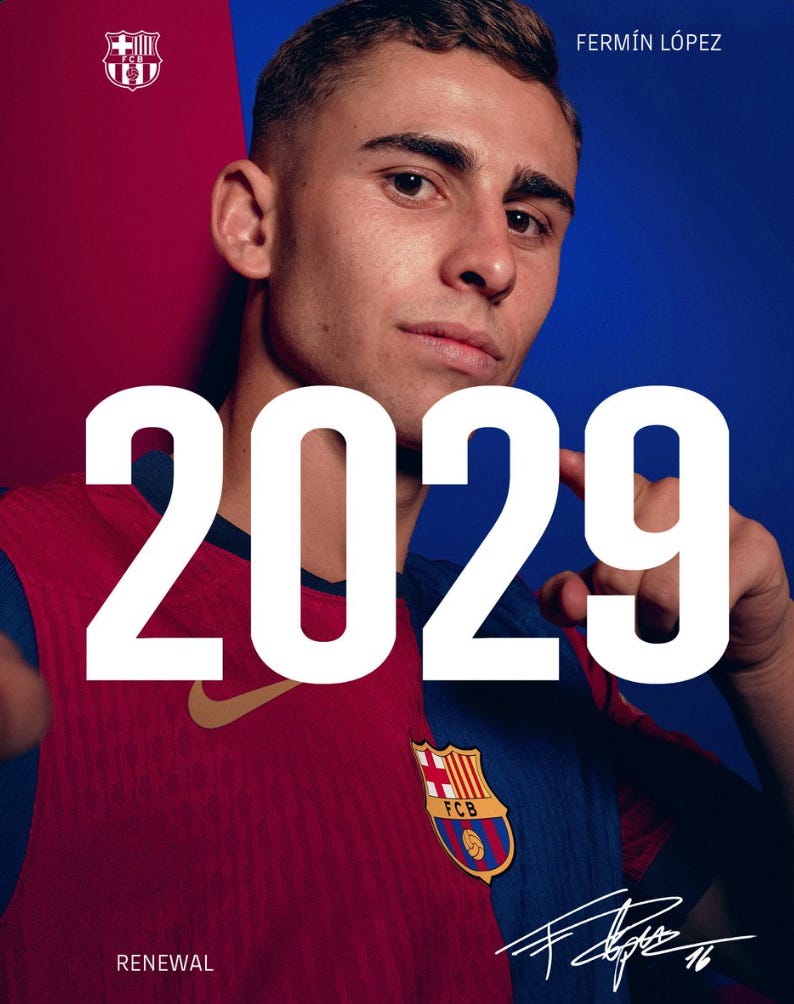 Barcelona confirm FermĂn LĂłpez has signed a new deal until June 2029. His new release clause will be âŹ500m. He didnât even want to listen to any approach from Premier League clubs last summer.