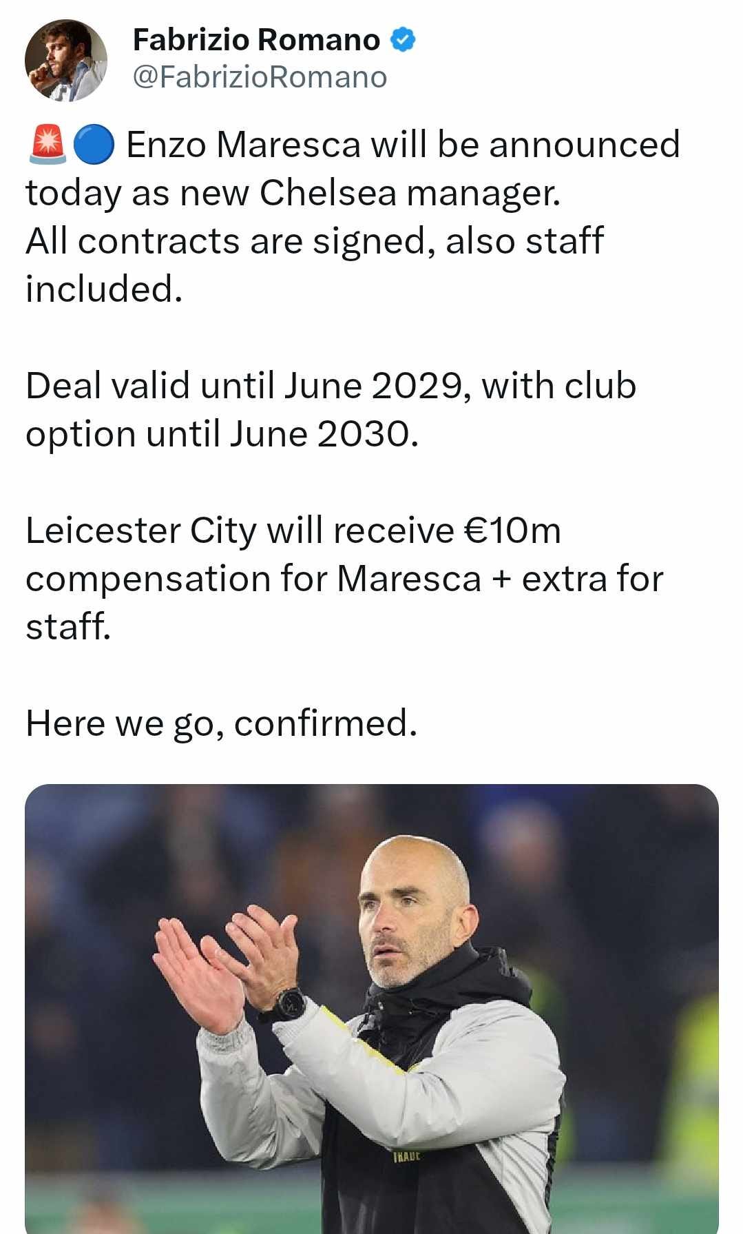 "Leicester City will receive €10m compensation for Maresca + extra for staff.
