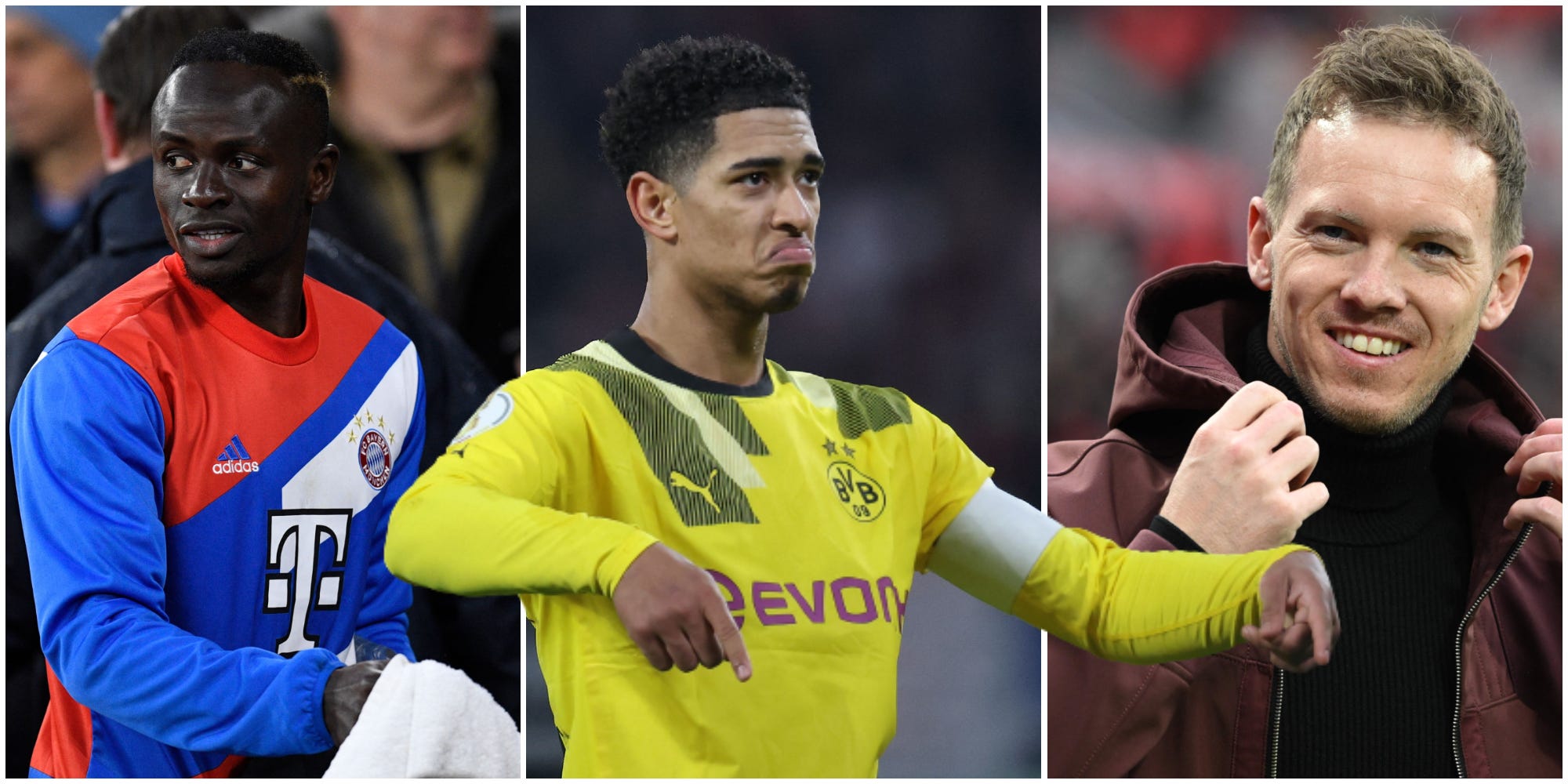 [From left to right: Sadio Mané, Jude Bellingham and Julian Nagelsmann]