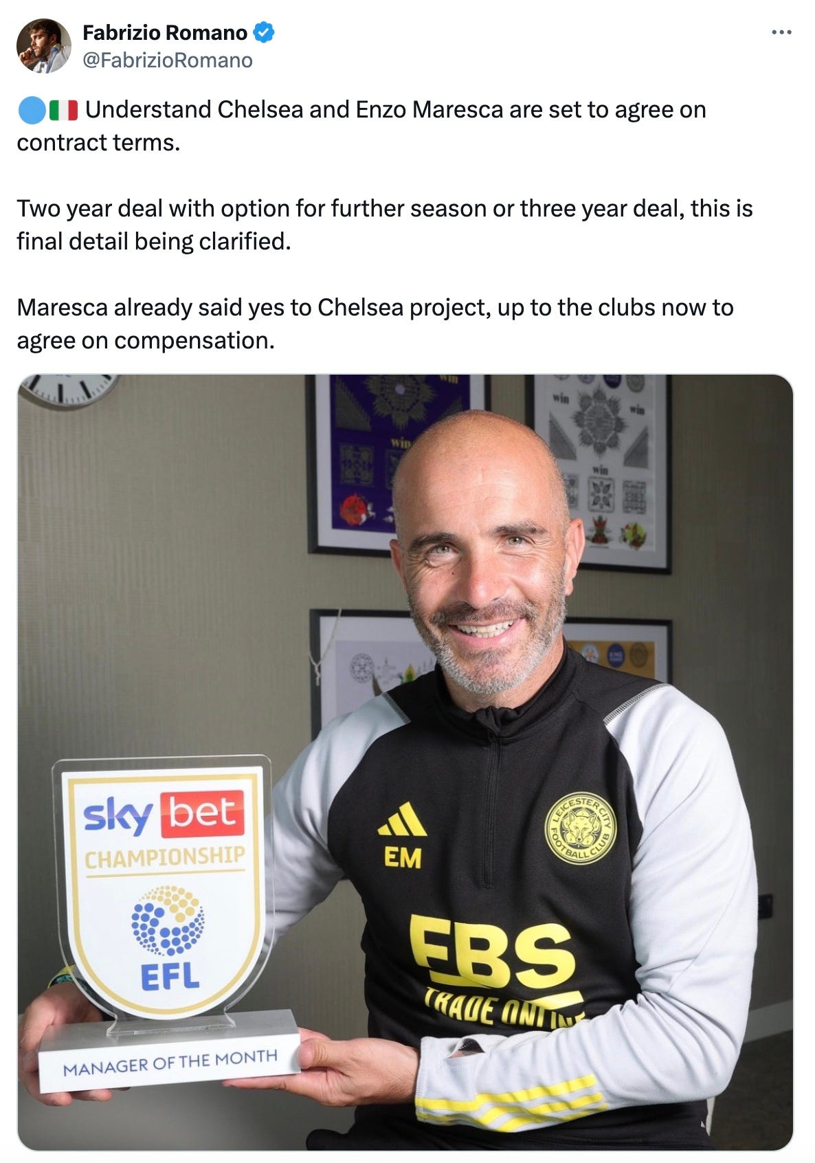 “Maresca already said yes to Chelsea project, up to the clubs now to agree on compensation.”