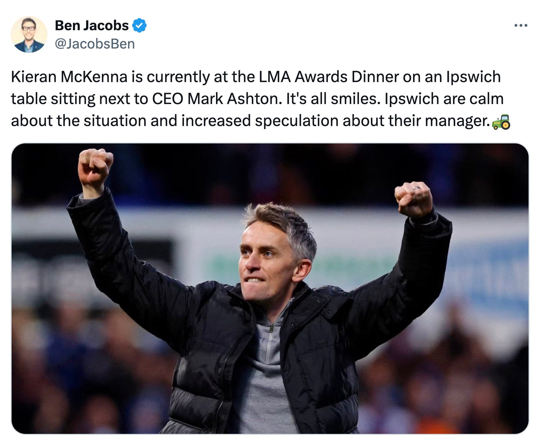 Jacobs tweeted: “Kieran McKenna is currently at the LMA Awards Dinner on an Ipswich table sitting next to CEO Mark Ashton. It's all smiles. Ipswich are calm about the situation and increased speculation about their manager.”