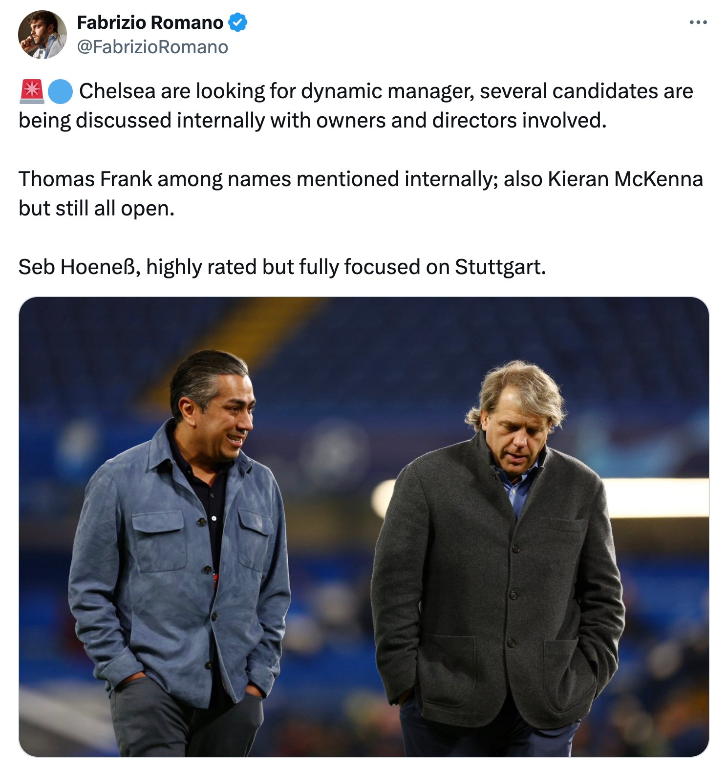 “Thomas Frank among names mentioned internally; also Kieran McKenna but still all open. Seb Hoeness, highly rated but fully focused on Stuttgart.”